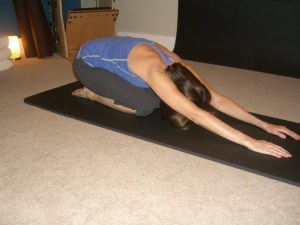 After completion of Swan, sit back on your knees, resting buttocks on or near heels. Place forehead on or near mat, arms extended out long in front. Breathe deeply, at least three deep breaths, relax.