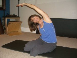 Lateral extension/stretch, obliques. Sit upright facing side of mat – both legs curled at your right side, knees and ankles stacked on top of one another. Hold right ankle with right hand, left hand reaches up to ceiling, overhead. INHALE as you stretch right, up and over your legs, EXHALE to deepen. INHALE, lift posture upright as you windmill arms overhead, left hand to mat at your left side, right hand reaching overhead stretching to left, EXHALE to deepen stretch. INHALE back upright (engaging obliques to lift) beginning the stretch to right side. REPEAT 3 times, change sides, REPEAT 3 times.