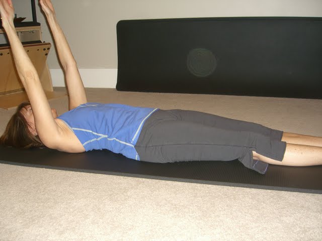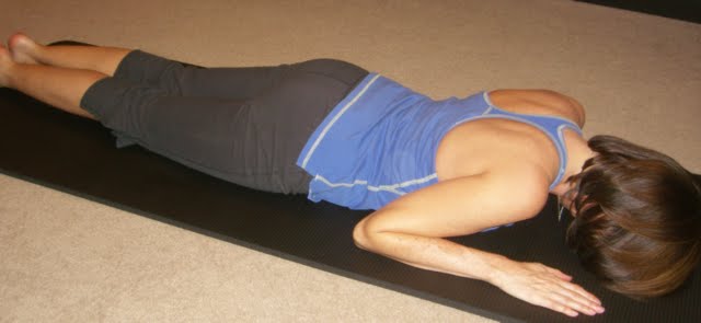 Extension of spine Lie face down on mat, hands palm down directly under shoulders, legs zipped together and extended long behind you, forehead to mat. INHALE as you reach forward with crown of head, engaging abdominals to support spine, slowly lifting yourself off of mat in an arch, widening chest. EXHALE as you reach forward with head/neck, slowly lowering back down to mat. This should not be felt in lower back, as abdominals are engaged to support – discontinue if you feel any lower back discomfort. *Not advisable for anyone with active back pain, instability, or injury.