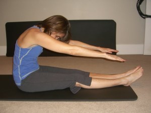 Sit upright and tall on mat with legs and arms extended long in front of you, heels glued together.