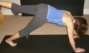 REPEAT entire set 5 times – or until you’ve completed “50” arm pumps. Focus on core, abdominal control, and ‘scooping’ the belly in, suction cupping navel to your spine – especially as you exhale. May also be modified to table top leg position shown in second photo.
