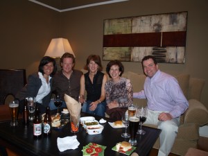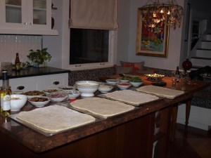 Saturday night, our friends made gourmet pizzas with the best home-made crust I have ever tasted. I dined at Spago’s last week, the original gourmet pizza restaurant and was disappointed; my fig and goat cheese pizza at Spago’s was not half as good as our friend’s. Their topping selections ranged from rotisserie grilled chicken and fresh sausage on the stove to roasted figs, sautéed red onions, truffle oil and spicy red sauce. The list of unique and delicious ingredients was endless. Forgetting that John had been an Exec at Domino’s in a past life, the tweaking and cooking resulted in a potential competitor.
